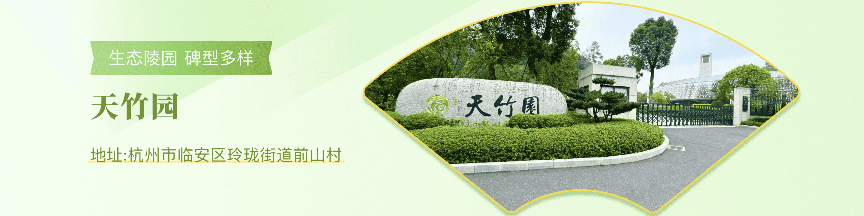 天竹园公墓是由浙江国兴投资集团有限公司与杭州盛安投资有限公司合营的国有控股公司,于2020年6月正式开园。 福地天竹园紧随政策要求,符合社会需求,探求行业趋势,顺循环境建设,解决百姓民生需求,为杭州殡葬业提供多功能服务平台,将成为与《临安十三五养老规划》相呼应、相联动的健康、生态、绿色墓园。“天竹园”处在天目山脉余脉丘陵,生态环境和空气质量俱佳,有利于植被的生长与人类的养息。“天竹园”规划总占地面积450余亩,分期开发建设,秉持先建公园,再建陵园,最后形成公园化生态陵园。该项目聚山势、融水脉、涵人文,富含起伏有形的宝地资源。“天竹园”。产品多样化、艺术化。天竹园旨在把陵园文化趋向阳光美丽、生态环保、温情惬意。天竹园顺北畅南,有富贵绵长、惠及子孙之气。天竹园环境地势被绵延丘陵山恋环抱,中间有大小三湖,仿佛巨龙首尾相望抱珠卧息。山为阳,水为阴,阴阳协调,砂环水抱,是稀缺资源之宝地。